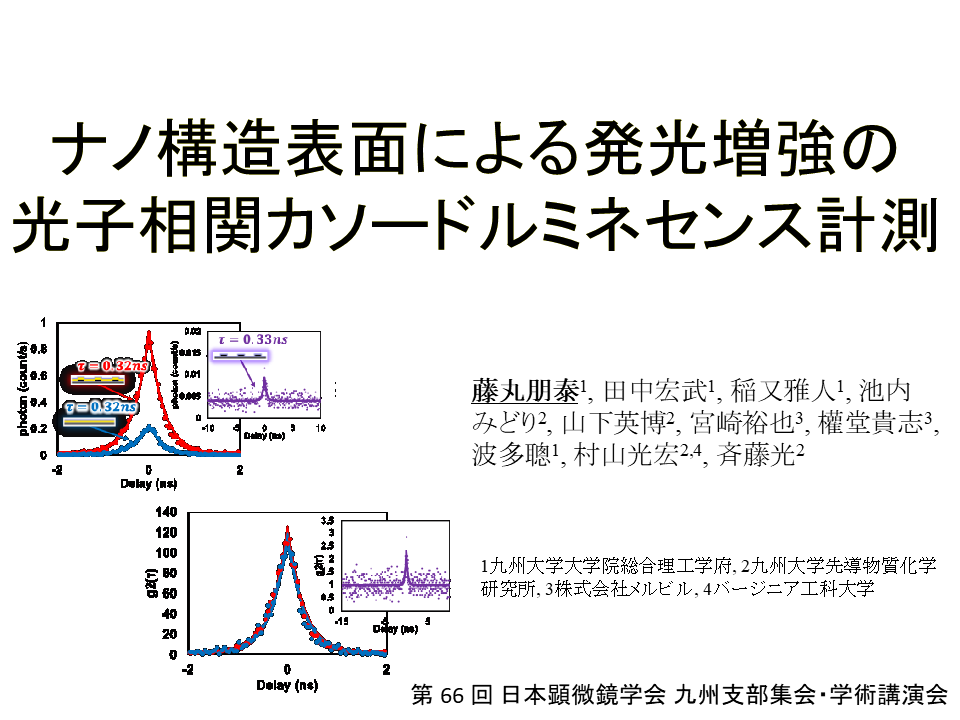 藤丸さん(M1)が第66回日本顕微鏡学会九州支部集会で口頭発表を行い、優秀発表賞を受賞しました 2024.12.14 お知らせ研究成果高速電子ナノ光 口頭発表 ナノ構造表面による発光増強の光子相関カソードルミネセンス計測 藤丸朋泰, 田中宏武, 稲又雅人, 池内みどり, 山下英博, 宮崎裕也, 權堂貴志, 波多聰, 村山光宏, 斉藤光