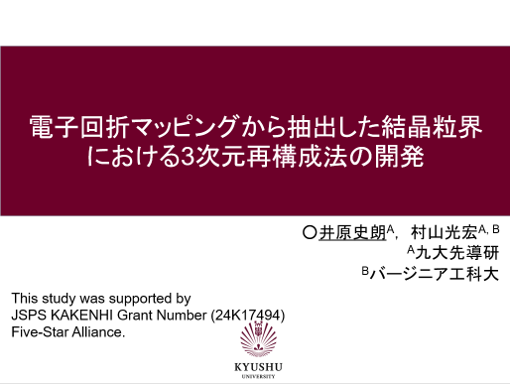 井原助教が日本物理学会 2025年春季大会 (オンライン)に参加し、発表を行いました 2025.03.19 お知らせ研究成果 井原助教が日本物理学会 2025年春季大会 (オンライン)に参加し、発表を行いました。 ・井原助教 口頭発表 「電子回折マッピングから抽出した結晶粒界における3次元再構成法の開発 」